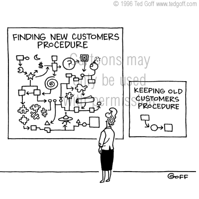 Cartoons © Ted Goff sales cartoon 1798: Two charts:  Finding new customers procedure (complex), Keeping old customers procedure (simple)