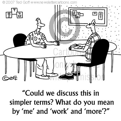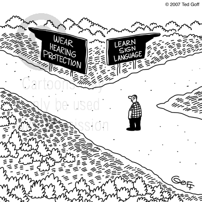 Cartoons © Ted Goff safety cartoon 5690: Fork in road with two signs: