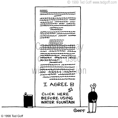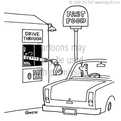 Cartoons © Ted Goff computer cartoon 2752: Robot arm holds out bag of fast food from the drive through window of an automated fast food restaurant.