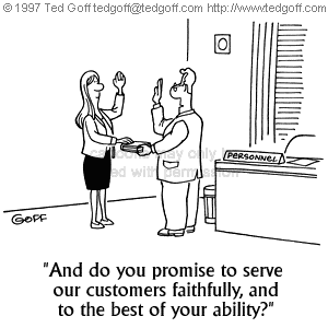 Cartoons © Ted Goff customer service cartoon 2176: Personnel manager swearing in new employee: