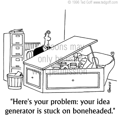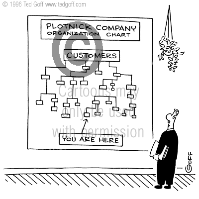 Cartoons © Ted Goff management cartoon 1773: Plotnick Company organization chart.  Customers at top.  You are here.