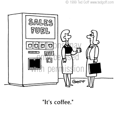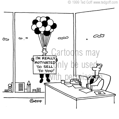Cartoons © Ted Goff sales cartoon 2715: Salesman floating with balloons outside window with sign: ÒIÕm really motivated to sell to you!Ó